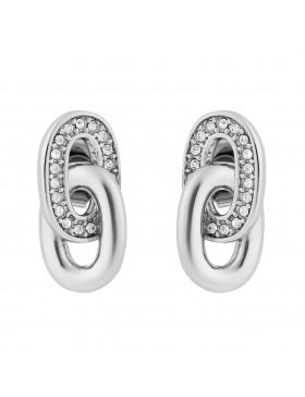 Un elemento decorativo a forma di ovale, simbolo dell’infinito, ed un pavé di cristalli Swarovski® conferiscono a questi orecchini, placcati in rodio, uno stile sofisticato.