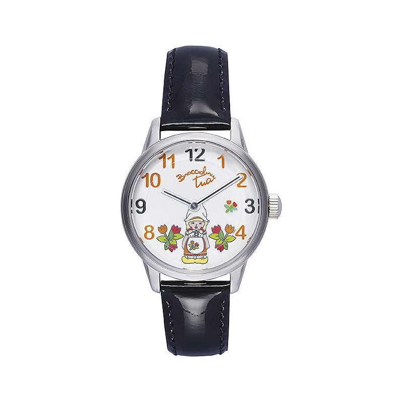 Orologio Braccialini, CASSA: in acciaio 316L di forma rotonda, Ø 30 mm, corona zigrinata chiusa a pressione, vetro minerale, BRACCIALE/CINTURINO: in similpelle lucida nera, QUADRANTE: Bianco con immagine "Olandesina" in rilievo con fiori rotanti