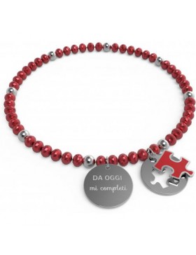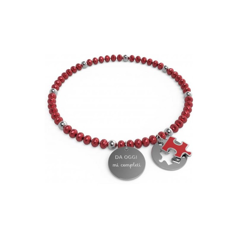 ll bracciale, su base elastica, è formato da rondelle in cristallo di 4 mm colore rosso, intercalate a perline di acciaio inossidabile 4 mm. Il proposito è rappresentato dai 3 ciondoli: una medaglia, diametro mm15, su cui è inciso il Buon proposito, un ciondolo a forma di tessera di puzzle smaltato di rosso sul cui retro è inciso il logo ANNA BIBLO’ e un terzo ciondolo tondo con intagliata la stessa forma del pezzo di puzzle.
