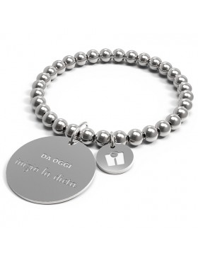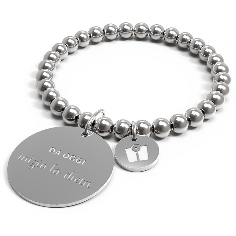 Bracciale da donna della collezione classic della marca 10 Buoni Propositi caratterizzato dall'incisione di uno dei buoni propositi realizzato in acciaio inossidabile aisi 304, nichel free. Sfere della dimensione di 6mm in acciaio. Medaglia in acciaio della dimensione di 28mm con inciso il buon proposito e sul retro il marchio Annabiblo°. Medaglietta in acciaio della dimensione di 12mm con incisa l’icona corrispondente. Bracciale montato su elastico. Lunghezza 17 cm.