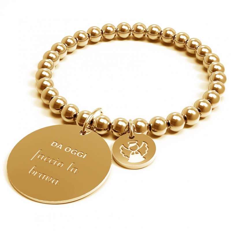 Bracciale da donna della collezione classic della marca 10 Buoni Propositi caratterizzato dall'incisione di uno dei buoni propositi realizzato in acciaio inossidabile aisi 304, nichel free. Sfere della dimensione di 6mm in acciaio. Medaglia in acciaio della dimensione di 28mm con inciso il buon proposito e sul retro il marchio Annabiblo°. Medaglietta in acciaio della dimensione di 12mm con incisa l’icona corrispondente. Bracciale montato su elastico. Galvanica oro. Lunghezza 17 cm.