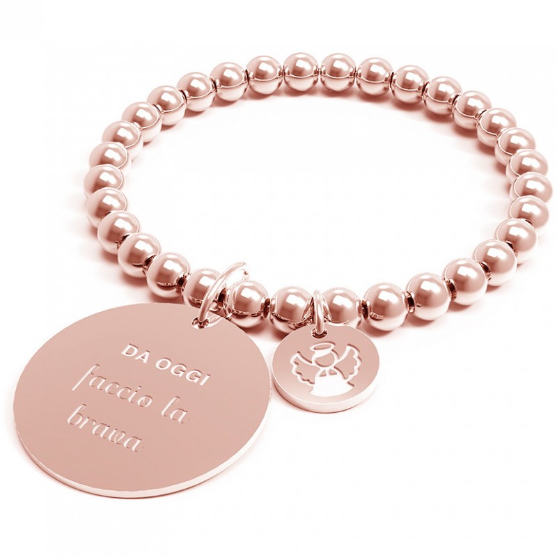 Bracciale da donna della collezione classic della marca 10 Buoni Propositi caratterizzato dall'incisione di uno dei buoni propositi realizzato in acciaio inossidabile aisi 304, nichel free. Sfere della dimensione di 6mm in acciaio. Medaglia in acciaio della dimensione di 28mm con inciso il buon proposito e sul retro il marchio Annabiblo°. Medaglietta in acciaio della dimensione di 12mm con incisa l’icona corrispondente. Bracciale montato su elastico. Galvanica oro rosa. Lunghezza 17 cm.