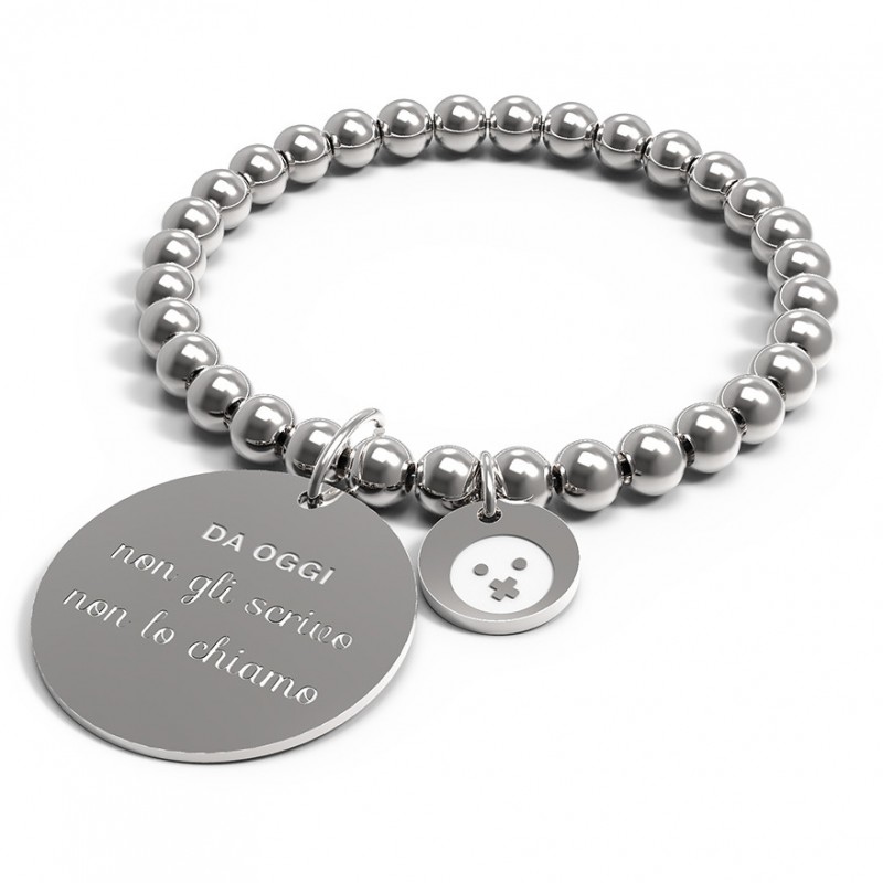 Bracciale da donna della collezione classic della marca 10 Buoni Propositi caratterizzato dall'incisione di uno dei buoni propositi realizzato in acciaio inossidabile aisi 304, nichel free. Sfere della dimensione di 6mm in acciaio. Medaglia in acciaio della dimensione di 28mm con inciso il buon proposito e sul retro il marchio Annabiblo°. Medaglietta in acciaio della dimensione di 12mm con incisa l’icona corrispondente. Bracciale montato su elastico. Lunghezza 17 cm.