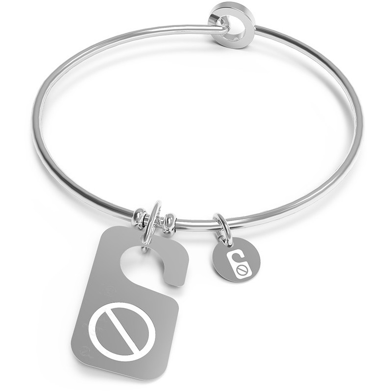 Bracciale da donna di 10 buoni propositi by annabiblo° della collezione bangles. gioiello con ciondolo a forma di icona con proposito inciso sul retro e medaglia di 8mm con incisa l'icona corrispondente con il marchio annabiblo° sul retro. nella medaglia è presente la frase da domani non ci sono x ness. bracciale rigido apribile del diametro massimo di 6,5 cm. realizzato in acciaio inossidabile e nichel free.