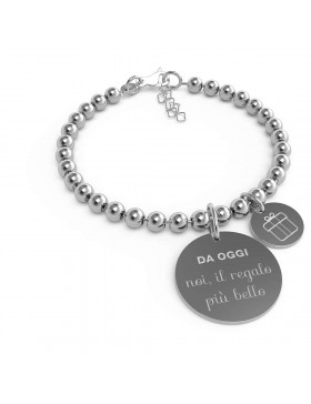 Bracciale da donna di 10 Buoni propositi by annaBiblo° della collezione classic. Bracciale con la scritta noi, il regalo piu' bello. Gioiello in acciaio inossidabile aisi 304 anallergico e sfere 6mm in acciaio. ciondoli: medaglia in acciaio 28mm con inciso il buon proposito con sul retro il marchio annabiblo° e medaglietta in acciaio 12mm con incisa l’icona corrispondente. Bracciale montato su catena con moschettone della lunghezza di cm 18 + estensione cm 3.