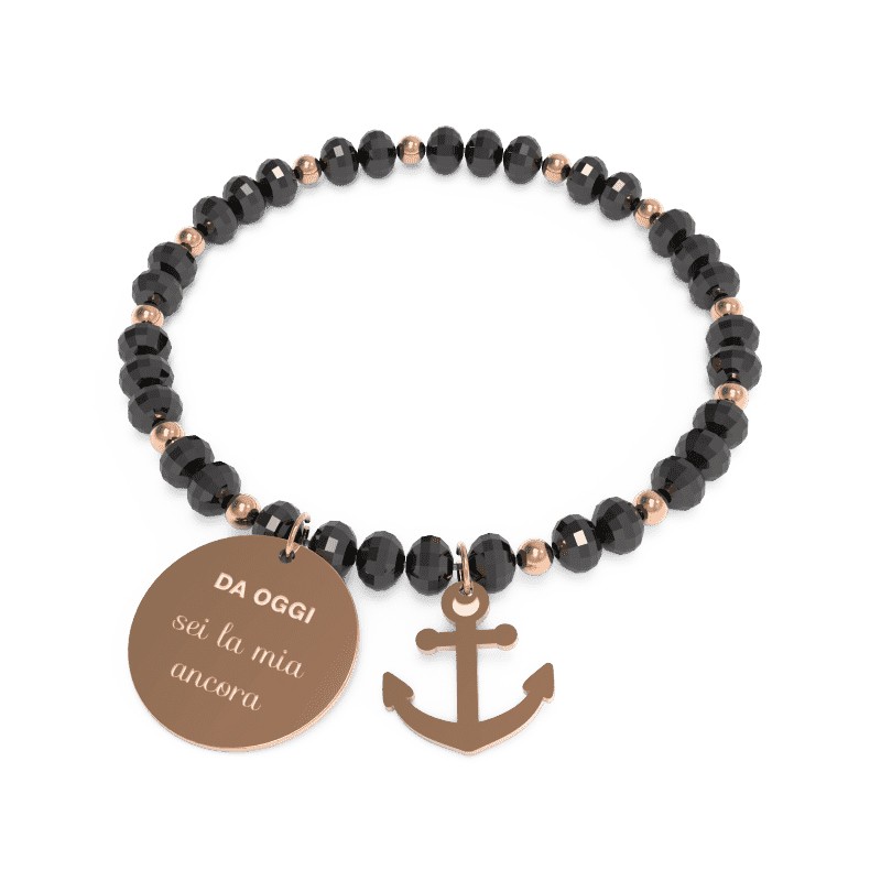 Il Bracciale è costituito da una serie di rondelle in cristallo di 6mm intercalate da palline in acciaio inossidabile di 4 mm montate su elastico di altissima qualità (17cm di lunghezza) da cui pendono una medaglia diametro 22mm (in acciaio inossidabile AISI 304, nichel free disponibile anche con galvanica in oro rosa con inciso il Buon proposito, sul retro il marchio annaBIBLO°) e un ciondolo a icona corrispondente al Buon proposito.