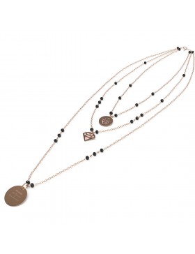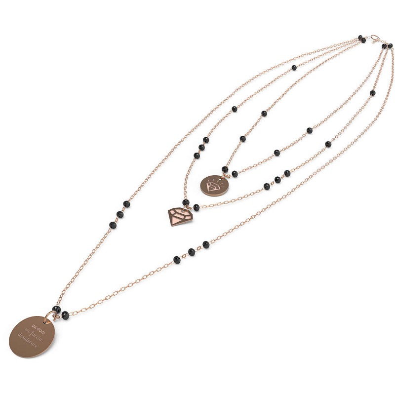 Collana da donna di 10 Buoni Propositi della collezione Crystal. Gioiello con la scritta da oggi mi faccio desiderare. Gioiello in acciaio inossidabile anallergico. Collana a 3 fili di catena sottile alternata, a rosario, a rondelle di cristallo 4 mm, 5 colori. galvanica oro rosa. ogni filo porta un ciondolo appeso: il primo una medaglia 12 mm su cui è incisa l'icona corrispondente al proposito, il secondo un ciondolo a forma della stessa icona, il terzo una medaglia i 15 mm con inciso il buon proposito e sul retro il marchio annabiblo°. le lunghezze sono: primo filo 39 cm, secondo filo: 43 cm, terzo filo: 55 cm, galvanica oro rosa.