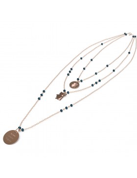 Collana da donna di 10 Buoni Propositi della collezione Crystal. Gioiello con la scritta da oggi scateno l'inferno. Gioiello in acciaio inossidabile anallergico. Collana a 3 fili di catena sottile alternata, a rosario, a rondelle di cristallo 4 mm, 5 colori. galvanica oro rosa. ogni filo porta un ciondolo appeso: il primo una medaglia 12 mm su cui è incisa l'icona corrispondente al proposito, il secondo un ciondolo a forma della stessa icona, il terzo una medaglia i 15 mm con inciso il buon proposito e sul retro il marchio annabiblo°. le lunghezze sono: primo filo 39 cm, secondo filo: 43 cm, terzo filo: 55 cm, galvanica oro rosa.