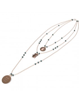 Collana da donna di 10 Buoni Propositi della collezione Crystal. Gioiello con la scritta da oggi scateno l'inferno. Gioiello in acciaio inossidabile anallergico. Collana a 3 fili di catena sottile alternata, a rosario, a rondelle di cristallo 4 mm, 5 colori. galvanica oro rosa. ogni filo porta un ciondolo appeso: il primo una medaglia 12 mm su cui è incisa l'icona corrispondente al proposito, il secondo un ciondolo a forma della stessa icona, il terzo una medaglia i 15 mm con inciso il buon proposito e sul retro il marchio annabiblo°. le lunghezze sono: primo filo 39 cm, secondo filo: 43 cm, terzo filo: 55 cm, galvanica oro rosa.