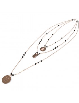 Collana da donna di 10 Buoni Propositi della collezione Crystal. Gioiello con la scritta da oggi scateno l'inferno. Gioiello in acciaio inossidabile anallergico. Collana a 3 fili di catena sottile alternata, a rosario, a rondelle di cristallo 4 mm, 5 colori. galvanica oro rosa. ogni filo porta un ciondolo appeso: il primo una medaglia 12 mm su cui è incisa l'icona corrispondente al proposito, il secondo un ciondolo a forma della stessa icona, il terzo una medaglia i 15 mm con inciso il buon proposito e sul retro il marchio annabiblo°. le lunghezze sono: primo filo 39 cm, secondo filo: 43 cm, terzo filo: 55 cm, galvanica oro rosa.