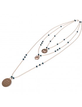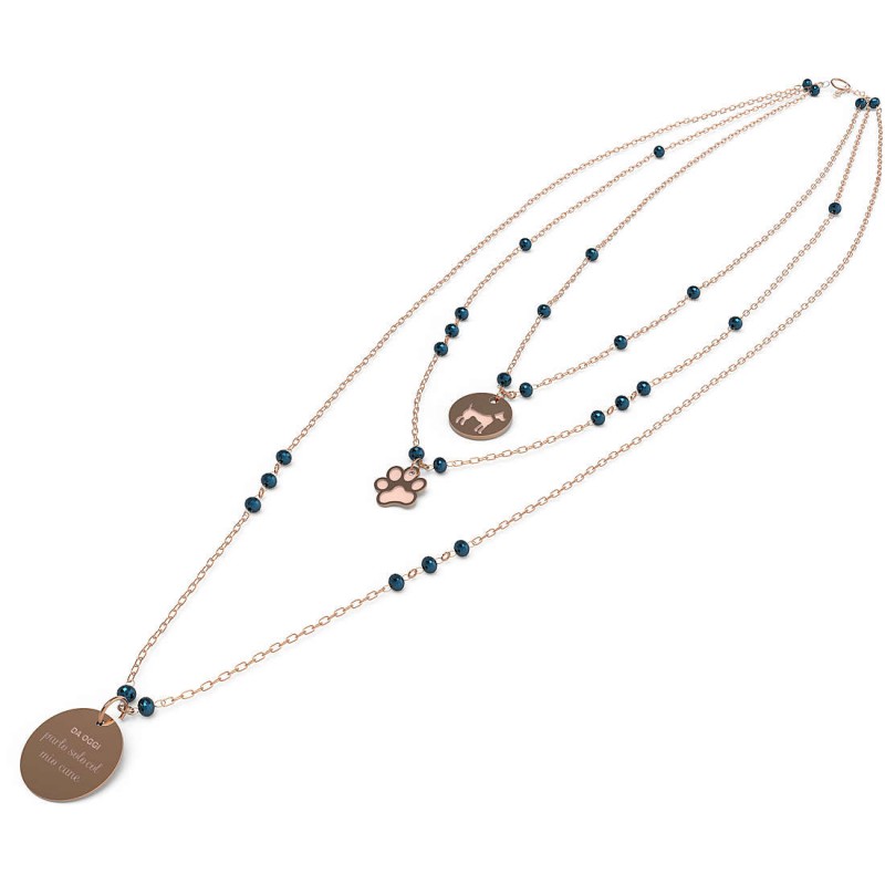 Collana da donna di 10 Buoni Propositi della collezione Crystal. Gioiello con la scritta da oggi parlo solo con il mio cane. Gioiello in acciaio inossidabile anallergico. Collana a 3 fili di catena sottile alternata, a rosario, a rondelle di cristallo 4 mm, 5 colori. galvanica oro rosa. ogni filo porta un ciondolo appeso: il primo una medaglia 12 mm su cui è incisa l'icona corrispondente al proposito, il secondo un ciondolo a forma della stessa icona, il terzo una medaglia i 15 mm con inciso il buon proposito e sul retro il marchio annabiblo°. le lunghezze sono: primo filo 39 cm, secondo filo: 43 cm, terzo filo: 55 cm, galvanica oro rosa
