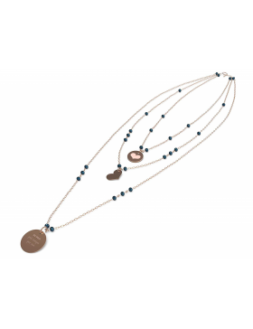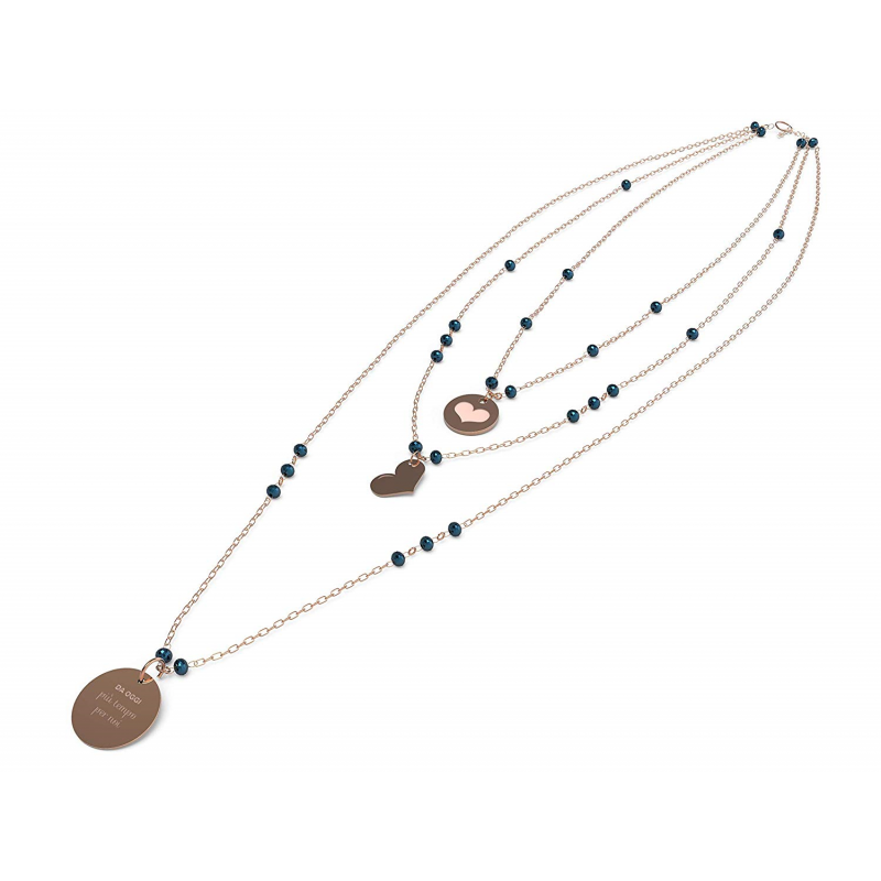 Collana da donna di 10 Buoni Propositi della collezione Crystal. Gioiello con la scritta da oggi più tempo per noi. Gioiello in acciaio inossidabile anallergico. Collana a 3 fili di catena sottile alternata, a rosario, a rondelle di cristallo 4 mm, 5 colori. galvanica oro rosa. ogni filo porta un ciondolo appeso: il primo una medaglia 12 mm su cui è incisa l'icona corrispondente al proposito, il secondo un ciondolo a forma della stessa icona, il terzo una medaglia i 15 mm con inciso il buon proposito e sul retro il marchio annabiblo°. le lunghezze sono: primo filo 39 cm, secondo filo: 43 cm, terzo filo: 55 cm, galvanica oro rosa.