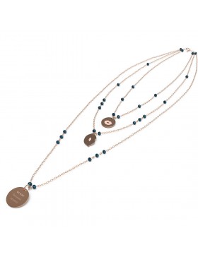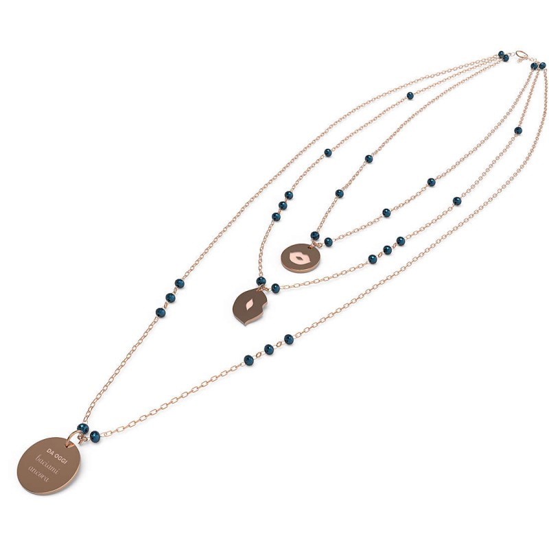Collana da donna di 10 Buoni Propositi della collezione Crystal. Gioiello con la scritta da oggi baciami ancora. Gioiello in acciaio inossidabile anallergico. Collana a 3 fili di catena sottile alternata, a rosario, a rondelle di cristallo 4 mm, 5 colori. galvanica oro rosa. ogni filo porta un ciondolo appeso: il primo una medaglia 12 mm su cui è incisa l'icona corrispondente al proposito, il secondo un ciondolo a forma della stessa icona, il terzo una medaglia i 15 mm con inciso il buon proposito e sul retro il marchio annabiblo°. le lunghezze sono: primo filo 39 cm, secondo filo: 43 cm, terzo filo: 55 cm, galvanica oro rosa.