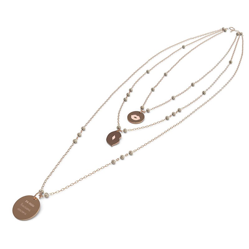 Collana da donna 10 Buoni Propositi della collezione Crystal. Gioiello con la scritta «da oggi baciami ancora». Gioiello ipoallergenico in acciaio inossidabile. Collana di 3 fili di catena fine alternata, con rosario, con rondelle di vetro di 4 mm, 5 colori. zincato in oro rosa. ogni filo ha un pendente pendente: il primo una medaglia di 12 mm su cui è incisa l'icona corrispondente allo scopo, il secondo pendente a forma di stessa icona, la terza medaglia di 15 mm con incisione lo scopo buono e nella parte dopo il marchio annabiblo °. le lunghezze sono: primo filo 39 cm, secondo filo: 43 cm, terzo filo: 55 cm, galvanico oro rosa.