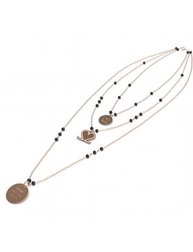 Collana da donna di 10 Buoni Propositi della collezione Crystal. Gioiello con la scritta da oggi non c'e' due senza te. Gioiello in acciaio inossidabile anallergico. Collana a 3 fili di catena sottile alternata, a rosario, a rondelle di cristallo 4 mm, 5 colori. galvanica oro rosa. ogni filo porta un ciondolo appeso: il primo una medaglia 12 mm su cui è incisa l'icona corrispondente al proposito, il secondo un ciondolo a forma della stessa icona, il terzo una medaglia i 15 mm con inciso il buon proposito e sul retro il marchio annabiblo°. le lunghezze sono: primo filo 39 cm, secondo filo: 43 cm, terzo filo: 55 cm, galvanica oro rosa.