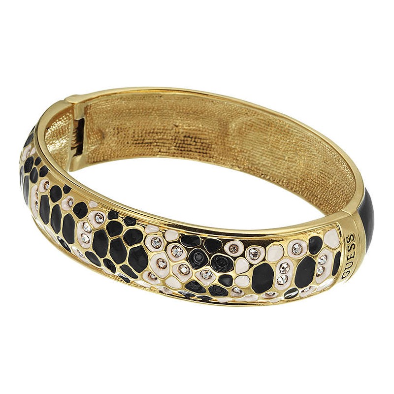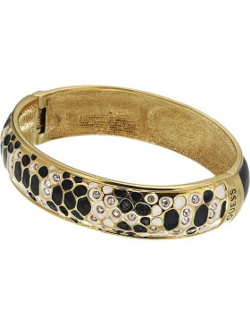 Gioiello GUESS, bracciale rigido gold con smalto nero e avorio effetto pitonato e cristalli. Chiusura a calamita.