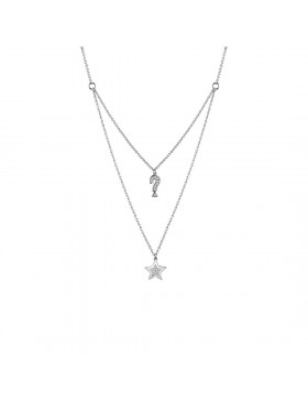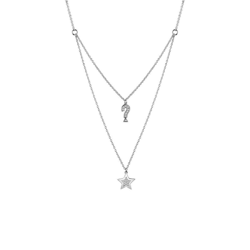 Collana da donna di guess della collezione #feelguess. Collana di colore silver doppia catena, charm stella con cristalli e punto di domanda con cristalli. La lunghezza di questo gioiello è 45,72 - 60 cm.