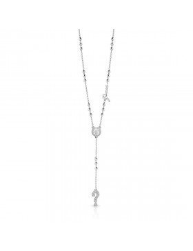 Collana Da Donna Di Guess. Collana Rosario Di Colore Argento, Con Piastrina Con A Forma Di "G" E Pendente A Forma Di "?" Impreziosito Da Cristalli. Gioiello Della Lunghezza Variabile Da 40 Cm A 45 Cm.La Referenza È Ubn85001