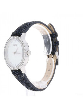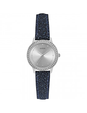 Orologio Solo Tempo Da Donna Di Guess Della Collezione Chelsea. Modello Con Cassa Tonda Della Dimensione Di 30 Mm In Acciaio Lucido Con Cristalli, E Quadrante Silver Con Indici A Tacche. Questo Orologio Ha Cinturino In Pelle Con Glitter Blu, Con Chiusura Buckle. Modello A Tre Sfere, Con Movimento Al Quarzo Analogico E Resistenza All'Acqua Di 30 Metri. La Referenza È W0648L20