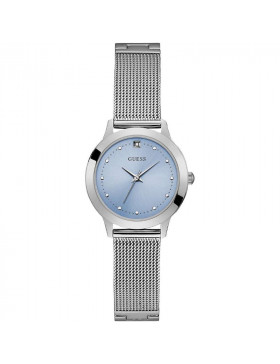 Orologio Solo Tempo Da Donna Di Guess. Orologio Con Cassa Del Diametro Di 30Mm In Acciaio Lucido E Quadrante Azzurro Con Dettagli Silver E Punto Luce Brillante Certificato. Bracciale In Acciaio Maglia Mesh. La Resistenza All'Acqua È Di 3 Atm. La Referenza È W1197L2