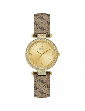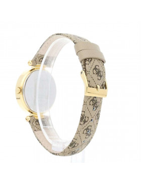 Orologio Solo Tempo Da Donna Di Guess. Orologio Con Cassa Del Diametro Di 32Mm In Acciaio Lucido Ip Gold Con Cristalli E Quadrante Champagne. Cinturino In Pelle Con Fantasia Logo 4G. La Resistenza All'Acqua È Di 3 Atm. La Referenza È W1230L2