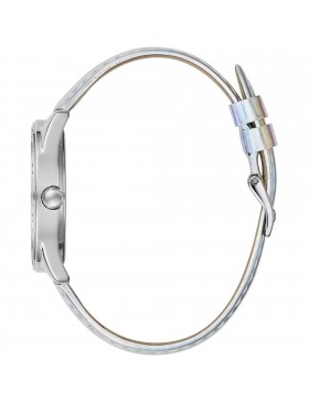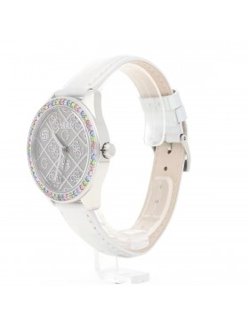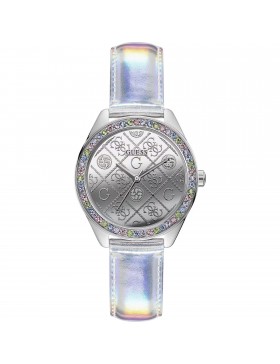 Orologio solo tempo da donna di Guess. Orologio con cassa di 37 mm in acciaio lucido con cristalli multicolor. Orologio con quadrante silver con motivo logo 4g. E cinturino in pelle silver cangiante, con chiusura con fibbia ad ardiglione. La resistenza all'acqua è di 10 atm. La referenza è gw0017l1
