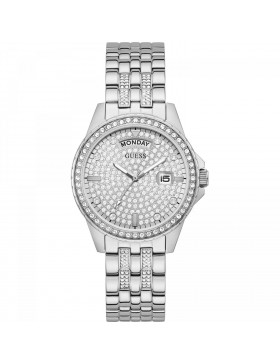 Orologio solo tempo da donna di Guess della collezione lady comet. Orologio con cassa da 38 mm in acciaio lucido con giro di cristalli. Il quadrante in acciaio con pavé di cristalli trasparenti e datario. La resistenza all'acqua è di 30 metri. La referenza è gw0254l1