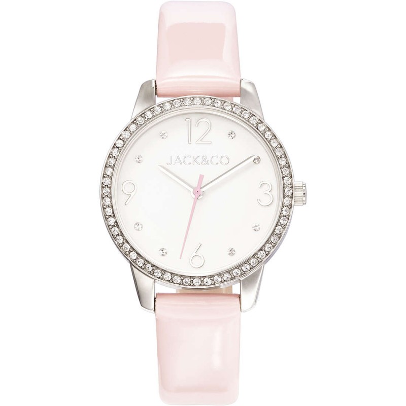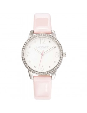 Orologio solo tempo da donna di JACK&CO della collezione DREAM. Orologio modello VALERIA con cassa del diametro di 32 mm in acciaio lucido con cristalli, quadrante bianco con dettagli rosa e cinturino in ecopelle rosa. Orologio con resistenza all'acqua di 5 atm.