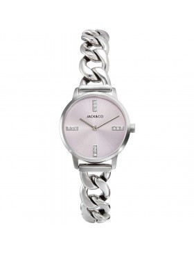 Orologio solo tempo da donna di JACK&CO della collezione SOPHIA. Orologio con cassa in acciaio inox del diametro di 30 mm, quadrante rosa, indici con cristalli e bracciale catena in acciaio inox. Orologio con resistenza all'acqua di 5 atm e movimento al quarzo.