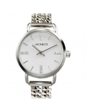 Orologio solo tempo da donna di JACK&CO della collezione STEFANIA. Orologio con cassa in acciaio inox del diametro di 32 mm, quadrante bianco, indici con cristalli e bracciale doppia catena in acciaio inox. Orologio con resistenza all'acqua di 5 atm e movimento al quarzo.