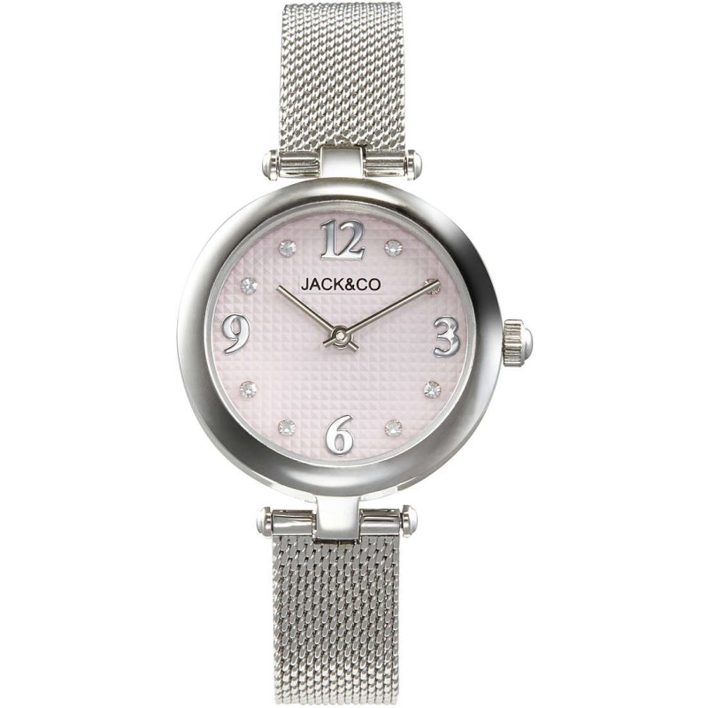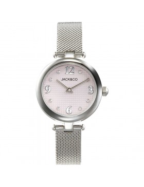 Orologio solo tempo da donna di JACK&CO della collezione francesca. Orologio con cassa in acciaio inox del diametro di 30 mm, quadrante guillochè rosa, indici con cristalli e bracciale mesh in acciaio inox. Orologio con resistenza all'acqua di 5 atm e movimento al quarzo.