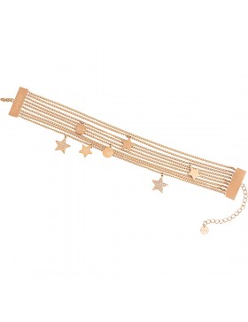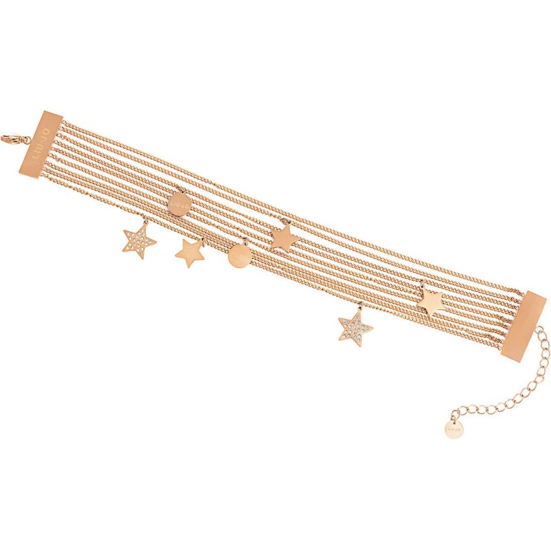 Bracciale da donna di LIU JO in acciaio e ip oro rosè con cristalli di colore bianco con catena rolo' e stella e medagliette pendenti.