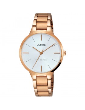 Solo Tempo da donna di LORUS della collezione classic. Solo Tempo con movimento al quarzo. caratterizzato da cassa in acciaio con trattamento ip oro rosa 32 mm, vetro minerale, quadrante white sunray e bracciale in acciaio con trattamento ip oro rosa con chiusura pieghevole con pulsante di rilascio. la resistenza all'acqua è di 5 atm.