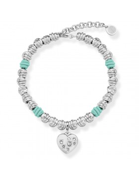 Bracciale donna in ottone e silicone con 26 nodi in ottone color argento e 4 nodi in silicone colore verde acqua, con pendente a cuore in acciaio color argento e cristalli in acciaio argento