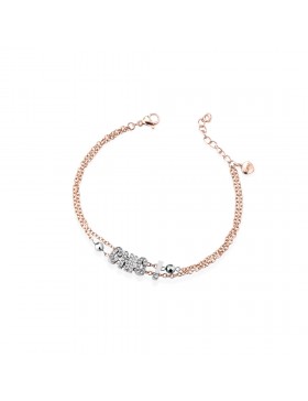 Bracciale donna con doppia catena in acciaio color oro rosa, impreziosito dalla scritta "CHIC!" in cristalli bianchi