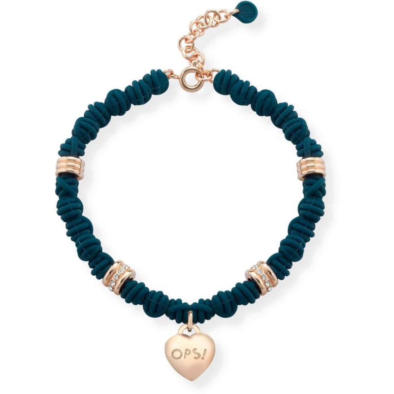 Il bracciale presenta un pendente a cuore in acciaio color oro rosa logato OPS!, medaglietta in silicone logata OPS! di colore verde petrolio e chiusura a moschettone regolabile
