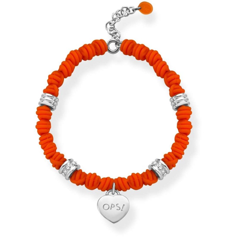 Il bracciale presenta un pendente a cuore in acciaio color argento logato OPS! , medaglietta in silicone logata OPS! di colore arancione e chiusura a moschettone regolabile