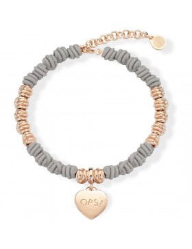 Il bracciale presenta un pendente a cuore in acciaio color oro rosa logato OPS!, medaglietta in acciaio logata OPS! color oro rosa e chiusura a moschettone.