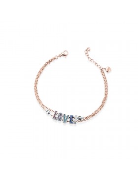 Bracciale donna con doppia catena in acciaio color oro rosa, impreziosito dalla scritta "LOVE!" in cristalli multicolor