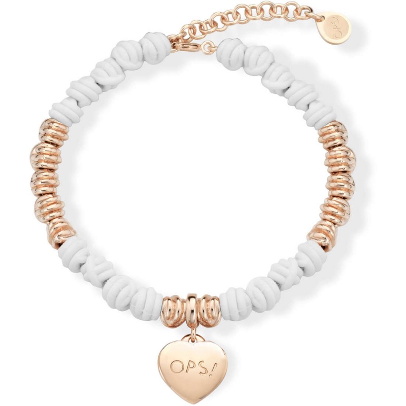 Il bracciale presenta un pendente a cuore in acciaio color oro rosa logato OPS! , medaglietta in acciaio logata OPS! color oro rosa e chiusura a moschettone
