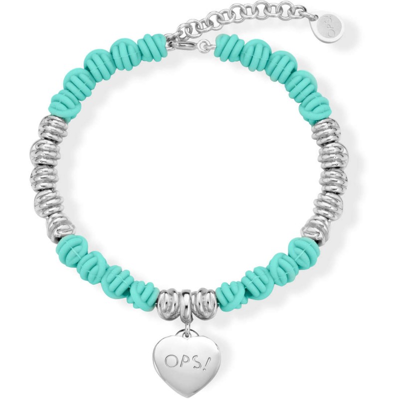 Il bracciale presenta un pendente a cuore in acciaio color argento logato OPS! , medaglietta in acciaio logata OPS! color argento e chiusura a moschettone.