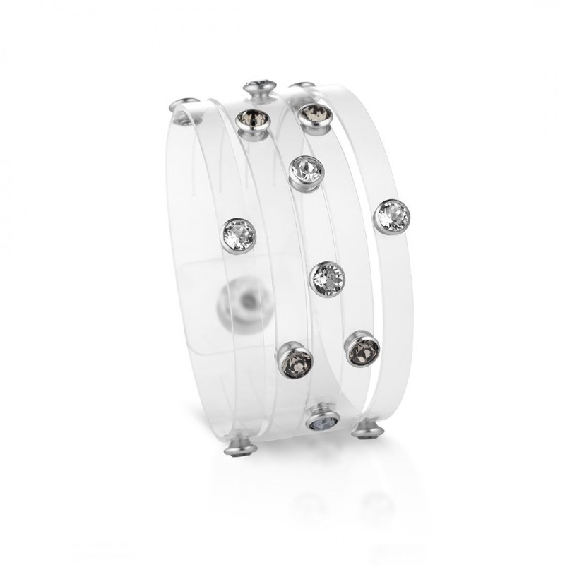 Bracciale donna a fascia in poliuretano trasparente composto da 5 fascette e caratterizzato da 14 bottoni in ottone color argento con cristalli Swarovski di colore grigio