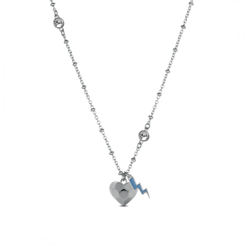 Dalla catena sottile della collana, impreziosita da due cristalli incastonati, pendono due pendenti: un cuore a specchi color argento e un fulmine smaltato azzurro
