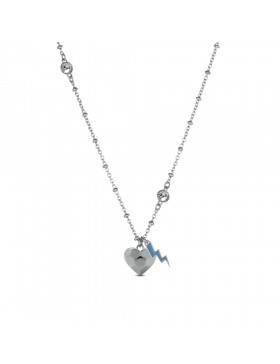 Collana donna modello catena sottile in acciaio color argento con motivo a microsfere e cristalli incastonati, impreziosita da un pendente a cuore e un fulmine smaltato azzurro