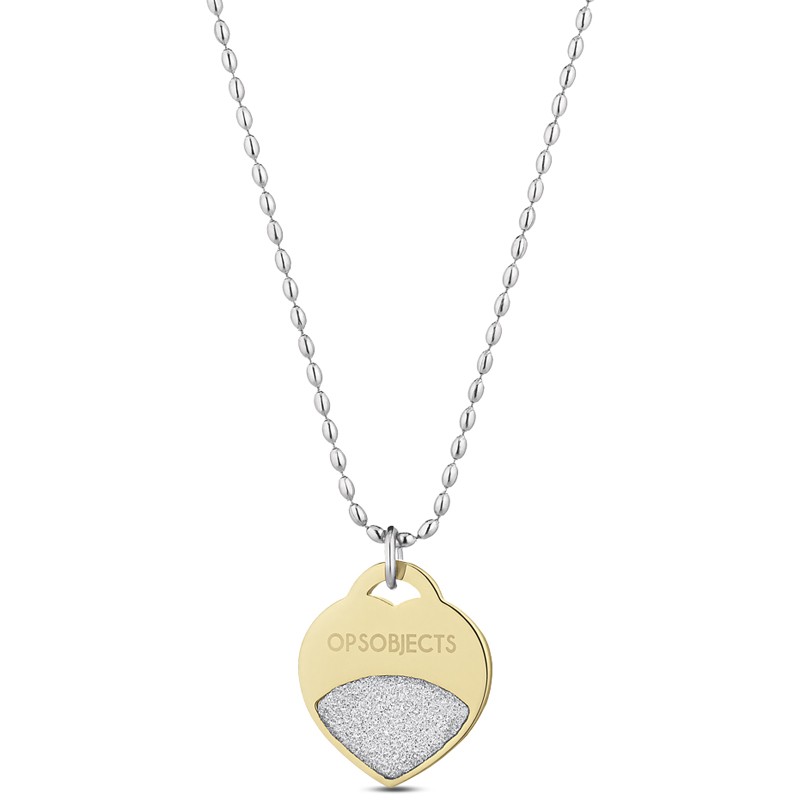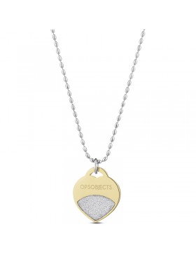 Collana donna con catena in acciaio con ovali color argento e pendente a cuore in acciaio colore oro impreziosito da microcristalli argentei.