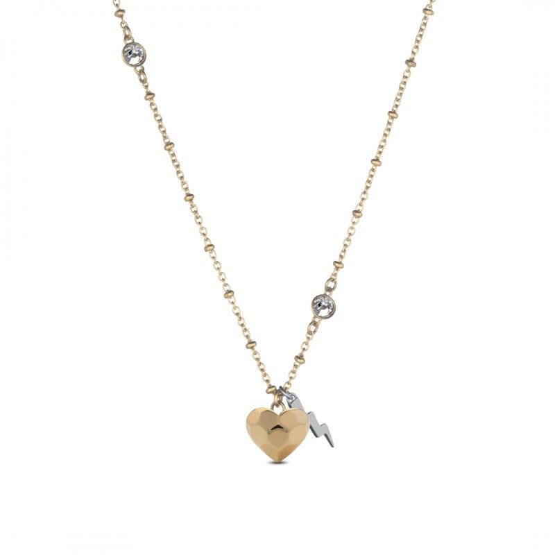 Dalla catena sottile della collana, impreziosita da due cristalli incastonati, pendono due charm: un cuore a specchi color oro e un fulmine color argento in metallo