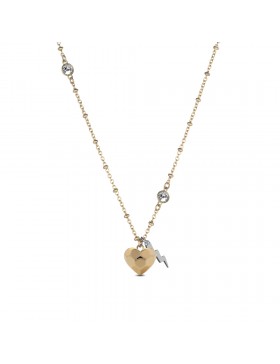 Collana donna modello catena sottile in acciaio color oro con motivo a microsfere e cristalli incastonati, impreziosita da un pendente cuore e un pendente fulmine
