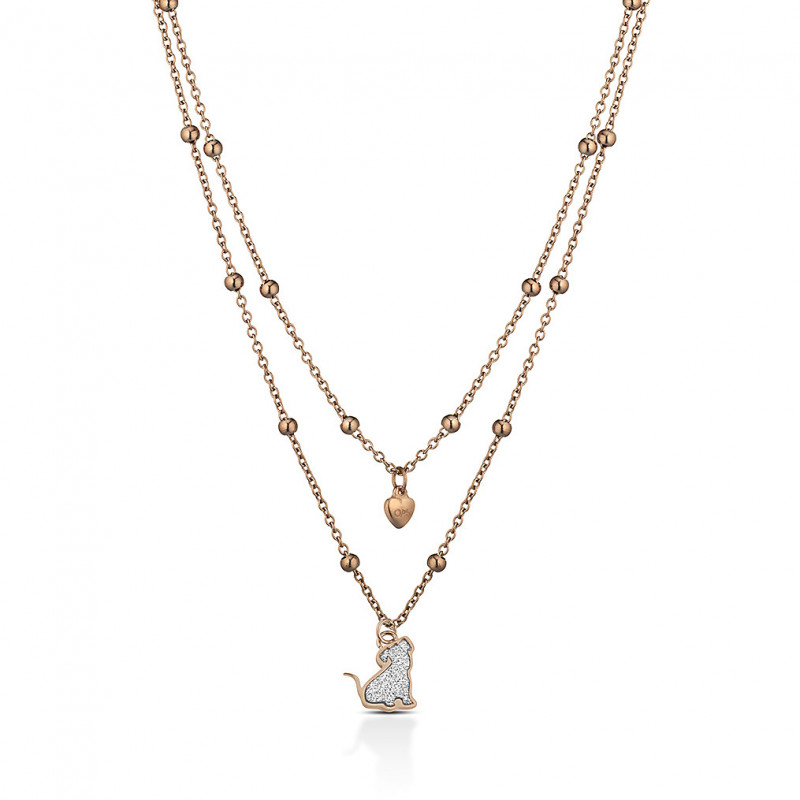 Collana Da Donna Di Ops Objects Della Collezione Glitter Fancy. Gioiello In Acciaio Di Colore Collana Doppia Catena Color Oro Rosa E Ciondolo Color Oro Rosa E Microcristalli Con Microcristalli Di Colore Argento. Ciondolo In Oro Rosa E Microcristalli Argentei E Dettagli A Forma Di Cane. Gioiello Della Lunghezza 50 Cm E Pendente: 11×11 Mm. Gioiello Con Chiusura A Moschettone. La Referenza È Opscl-375