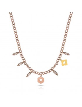 Collana da donna di opsobjects della collezione treasure. Gioiello realizzato in acciaio di colore oro rosa. Collana in acciaio con pendenti traforati e cristalli rosa. Lunghezza 48 cm regolabile a 53 cm. La referenza è opscl-728