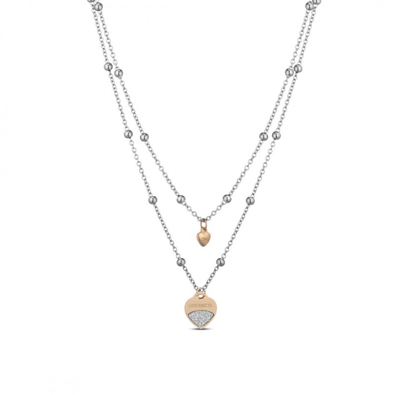 La collana presenta due medagliette in acciaio logate OPS!: una bombata a forma di cuore, agganciata alla prima catena, colore oro rosa e l’altra rotonda in versione silver in chiusura